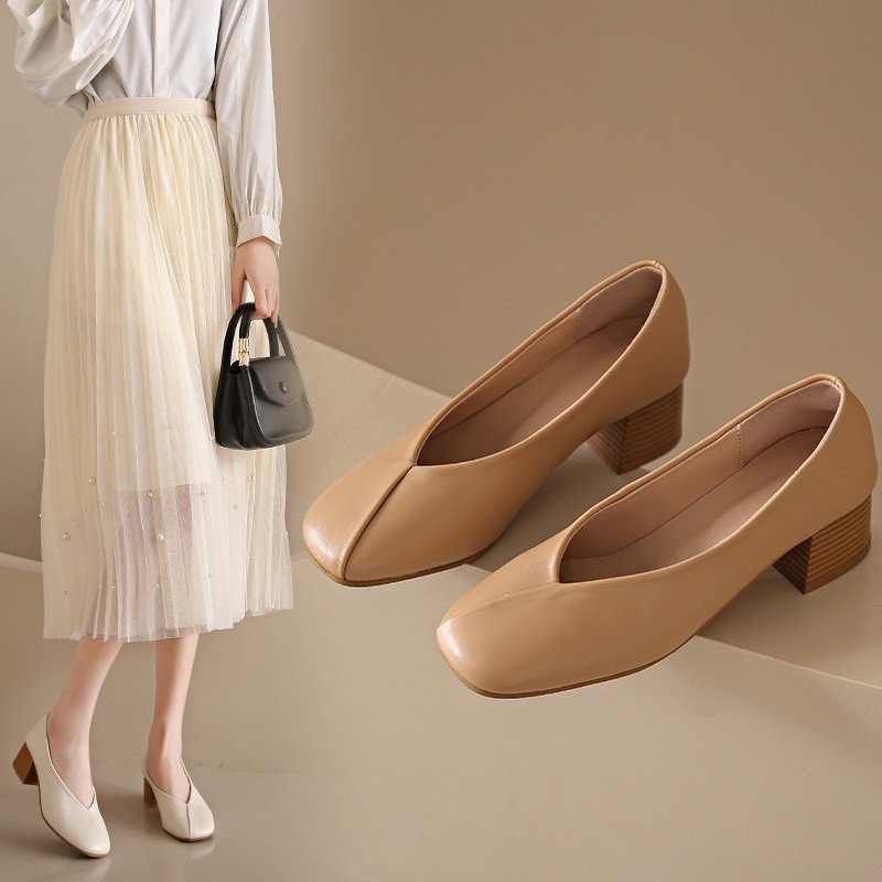 春新作レトロスクエアヘッド厚底ヒール婦人靴